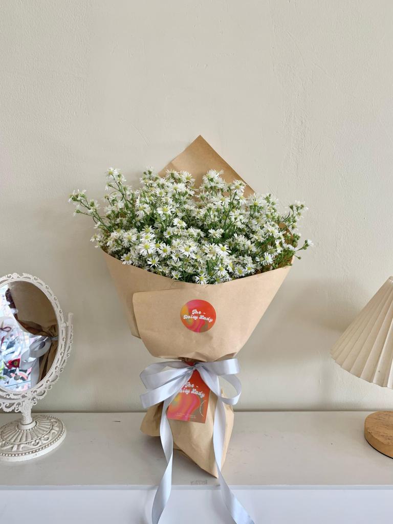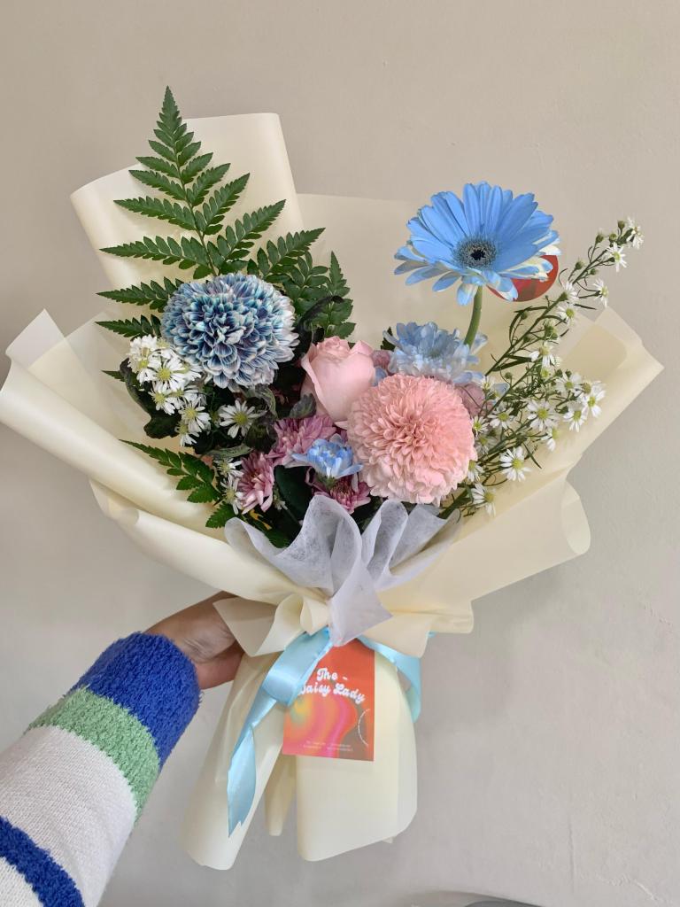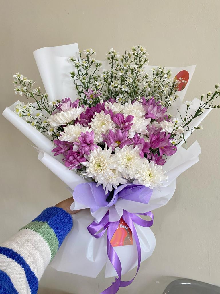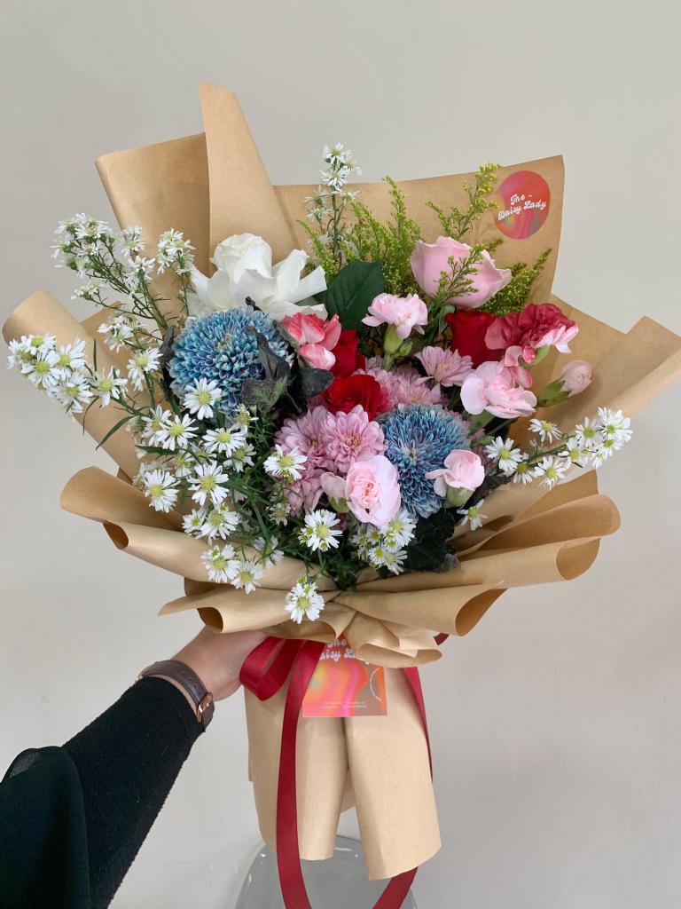Gompies, roses, carnation, aster, filler