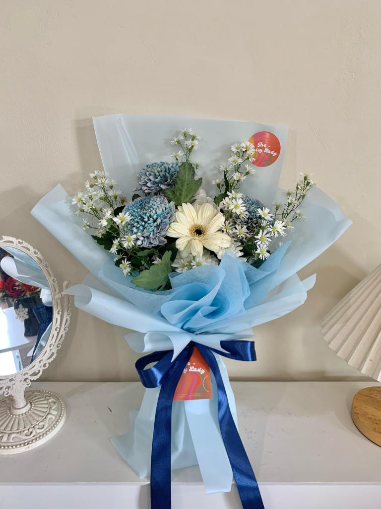 Three gompies, gerbera, aster, filler